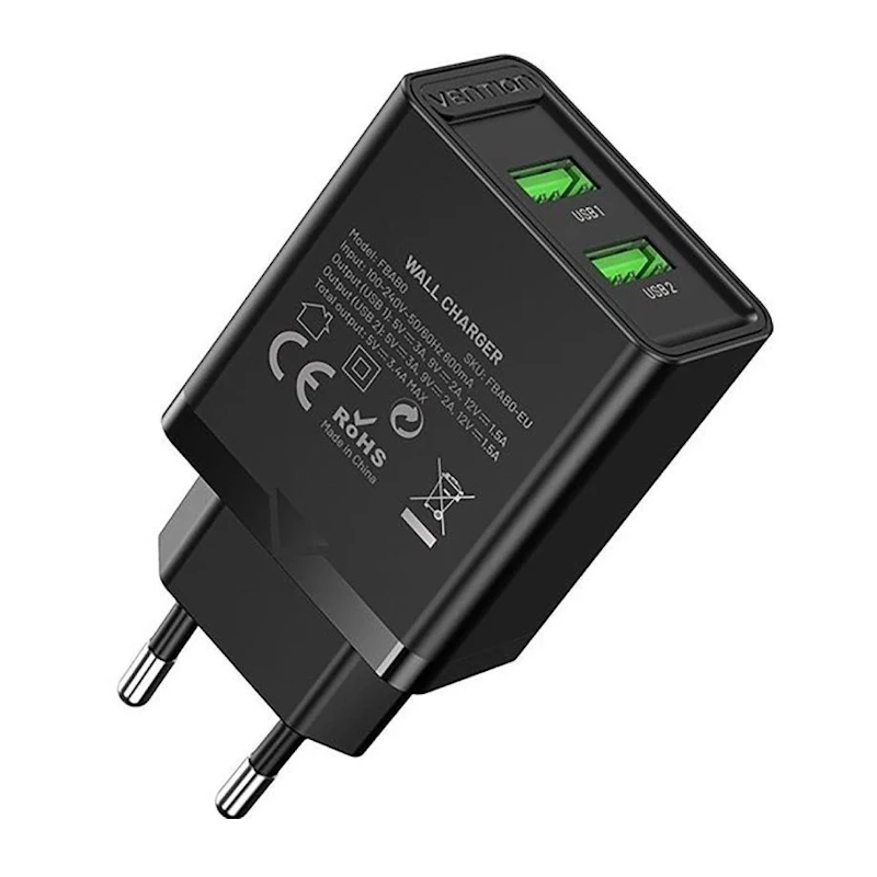 Cargador de Pared Vention FBAB0-EU 2xUSB 18W Negro