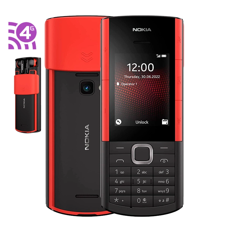 Móvil básico / senior NOKIA 5710 XpressAudio en color negro / rojo con pantalla de 2.4″ VGA, 240 x 320 píxeles, 48MB RAM + 128MB internos, 4G, SIM + SIM, microSD, bluetooth 5.0 y radio FM, cámara trasera de 0.3MP, batería de 1.450 mAh y conector microUSB