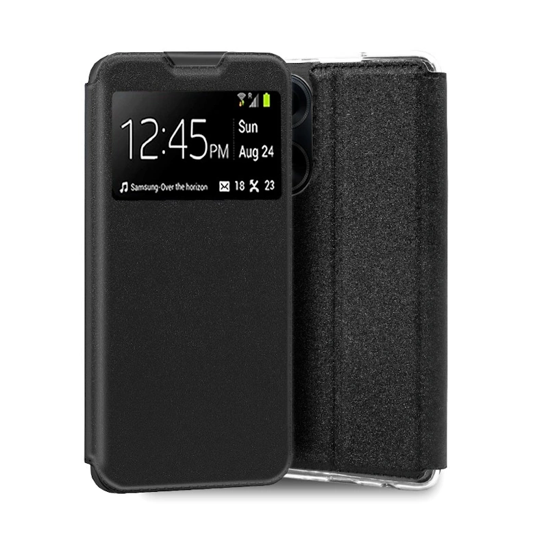 Apertura lateral tipo libro. Incorpora una carcasa específica del modelo de smartphone, para incrustarlo y dejarlo perfectamente encajado.