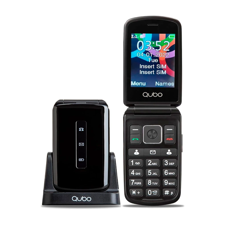 Móvil básico / senior Qubo P-210NW en color negro con pantalla de 2.8″ VGA, 240 x 320 píxeles, 4MB RAM + 4MB internos, 2G, SIM + SIM, microSD, bluetooth, audio jack, botón SOS y radio FM, cámara trasera de 0.3 MP, batería de 1.000 mAh y base de carga